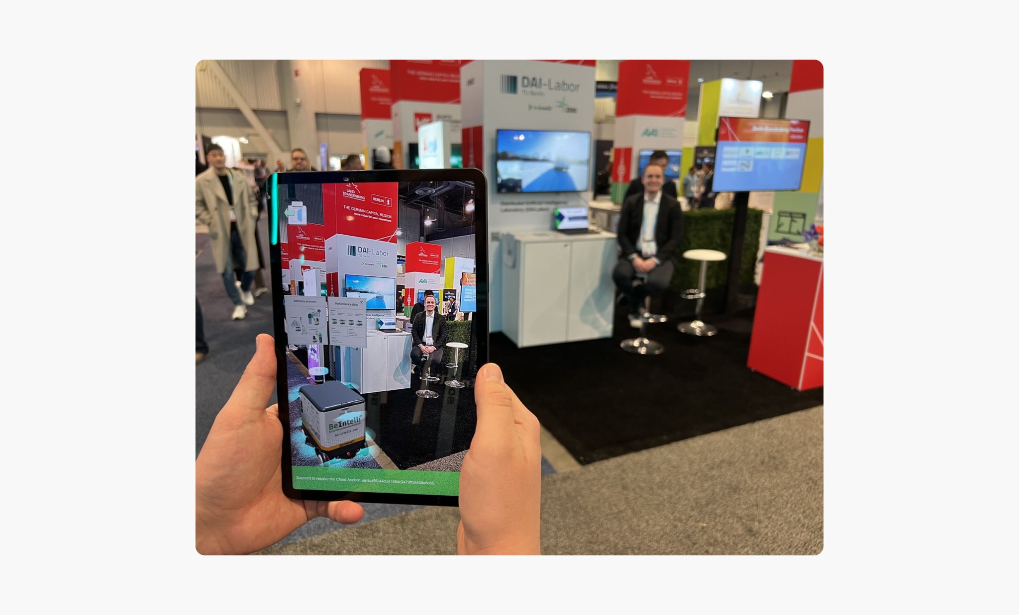 When vehicles and robots are available on-site, we enhance interactive exploration by overlaying 3D virtual information onto the real cars and robots using geolocation, allowing visitors to engage with the technology in a more dynamic way.