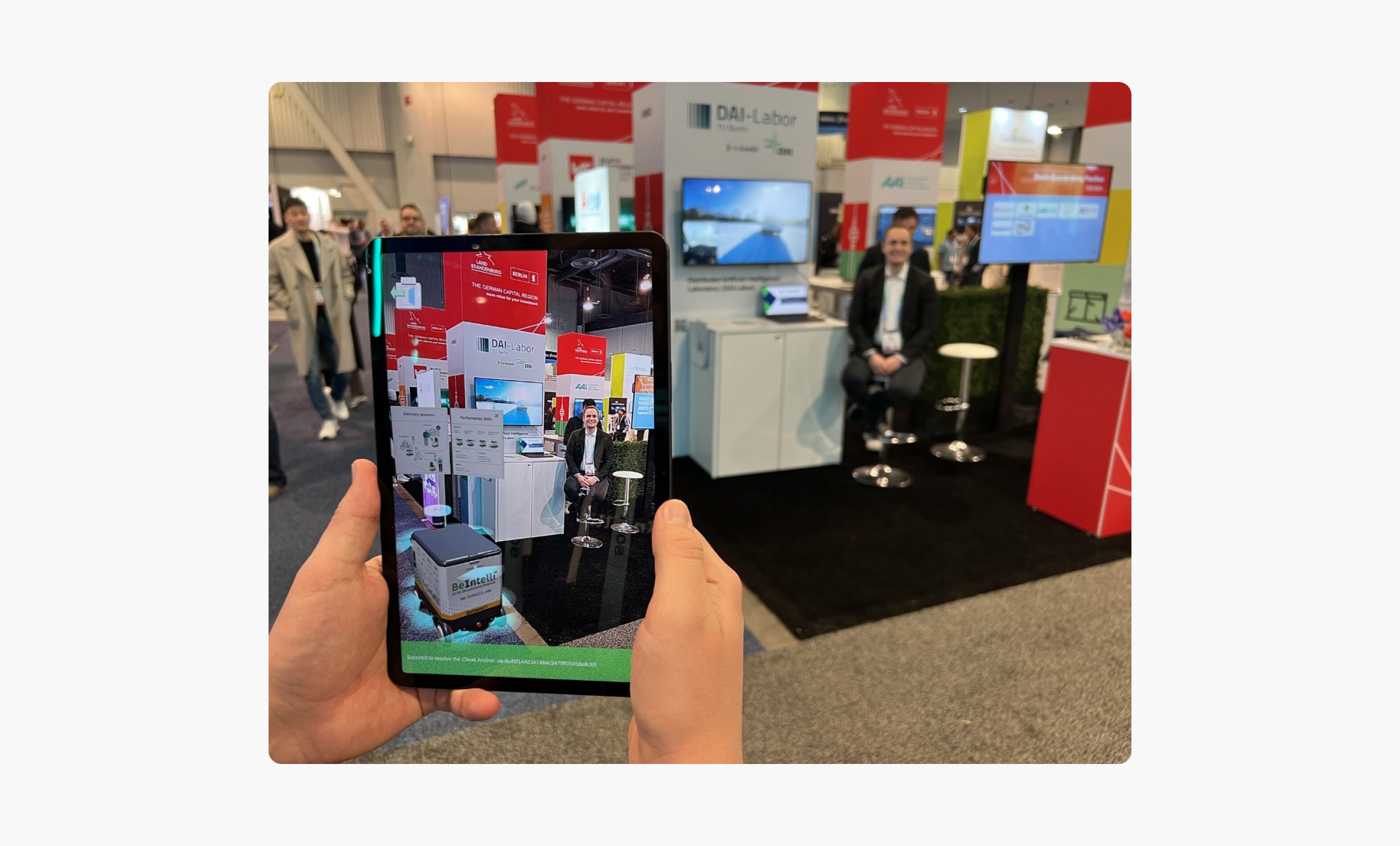 In scenarios where our autonomous vehicles and robots are not present, we have created a 1:1 3D model of the car and delivery robot, displaying real-time 3D LiDAR point clouds in augmented reality (AR) and providing extended information for all sensors to showcase our technology in an immersive way. In scenarios where vehicles and robots are present, we enhance interactive exploration by generating 3D virtual extended information on the real cars and robots through geolocation